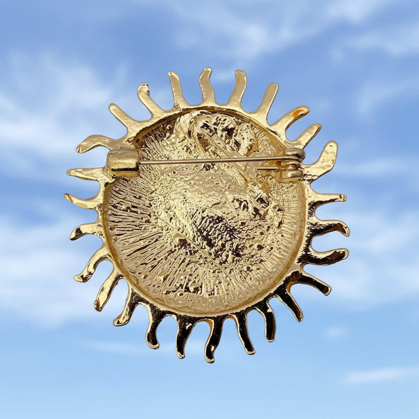 This Art Deco-inspired celebration sun brooch exemplifies the geometric sophistication and decorative brilliance of early 20th-century design movements. The piece showcases hallmark Art Deco characteristics—symmetrical sun rays, streamlined forms, and bold hand applied enamel work.