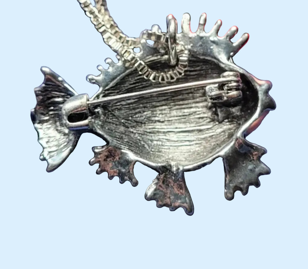 Inspired by sculptural modernist jewelry designs, such as Betsey Johnson's fish jewelry. This detailed piece features vibrant colorful pave' set rhinestones set against rich silver-tone sculpting, accented with hand applied oil enamel creating a bold, expressive look with refined visual impact.