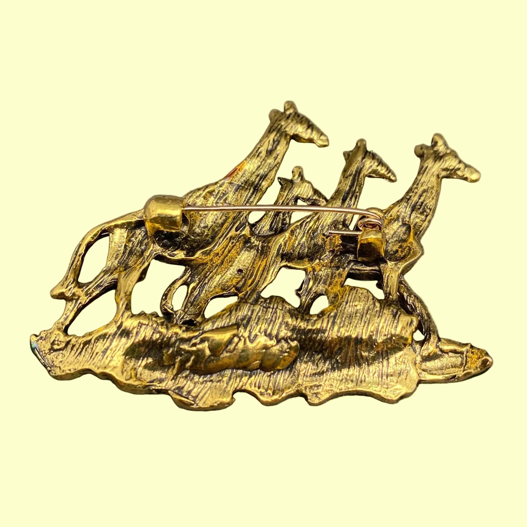 A striking large-scale giraffe herd brooch inspired by classic mid-century novelty jewelry design. This sculptural piece features multiple giraffes arranged in a dynamic herd composition, showcasing detailed texturing and dimensional craftsmanship throughout.