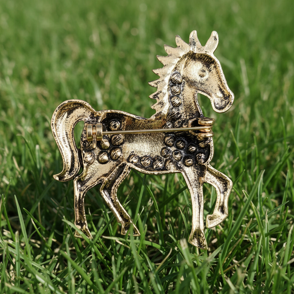 A beautifully textured horse brooch embellished with red crystal rhinestones across the body, a green faceted glass eye, a pearlized red enamel saddle, and refined golden accents. Crafted with dimensional detail, this striking piece offers rich color and sculptural presence.