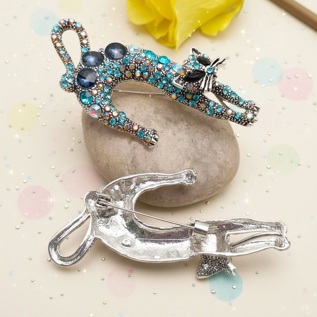 This designer-inspired cat brooch features a graceful, elongated silhouette richly adorned with vibrant crystal rhinestones in layered blue and iridescent tones. The sculptural form is accented with a sleek feline face and refined metal detailing, creating a striking balance between whimsy and sophistication.