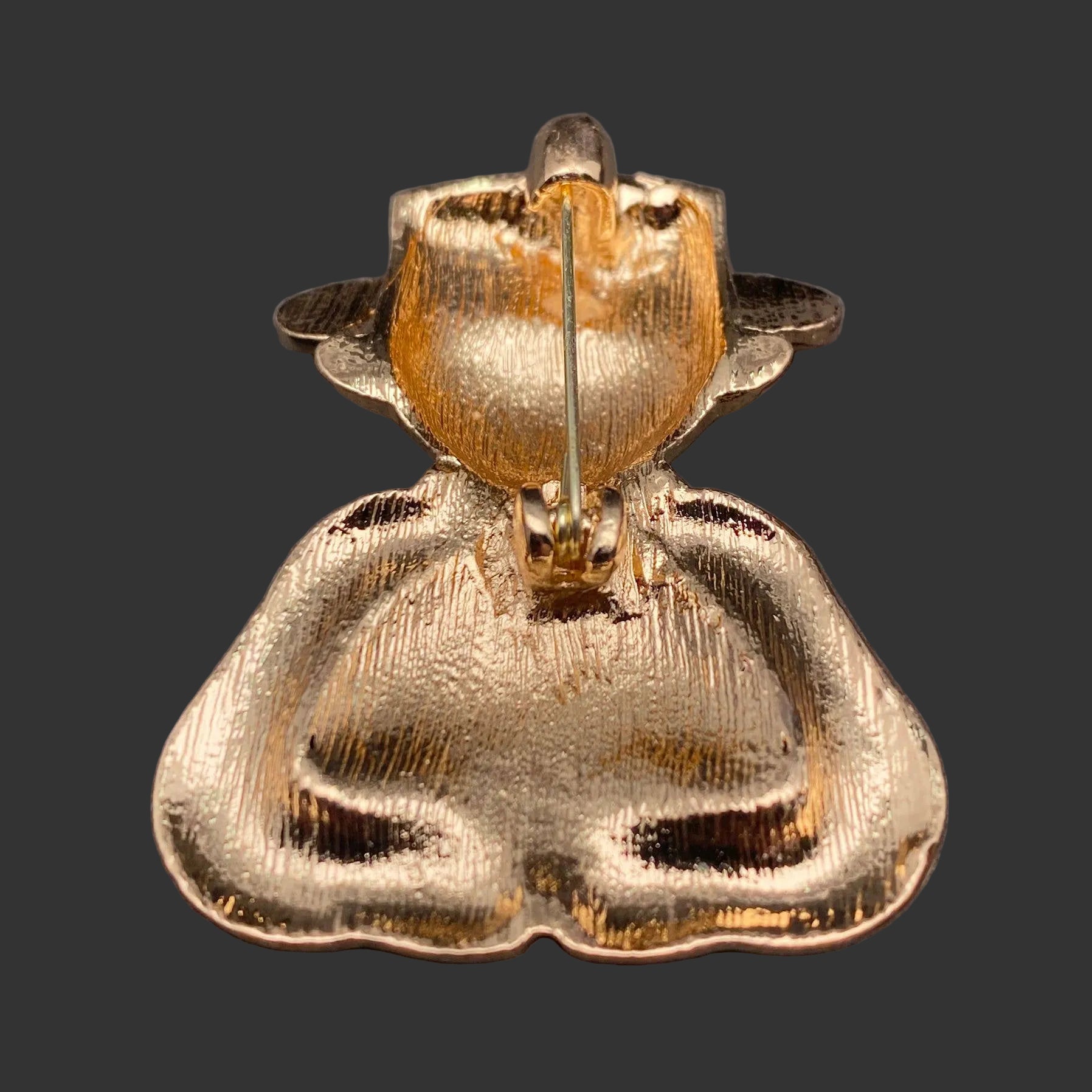 A vintage-inspired 1980s-era novelty brooch depicting a playful masked burger bandit character, finished with oil-dipped enamel and sparkling rhinestone accents. Rich in retro charm and pop-culture nostalgia, this whimsical piece captures the bold, collectible spirit of iconic fast-food–era design.