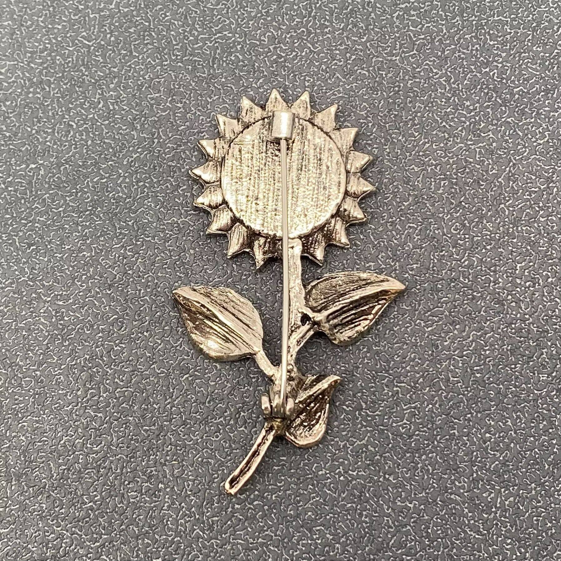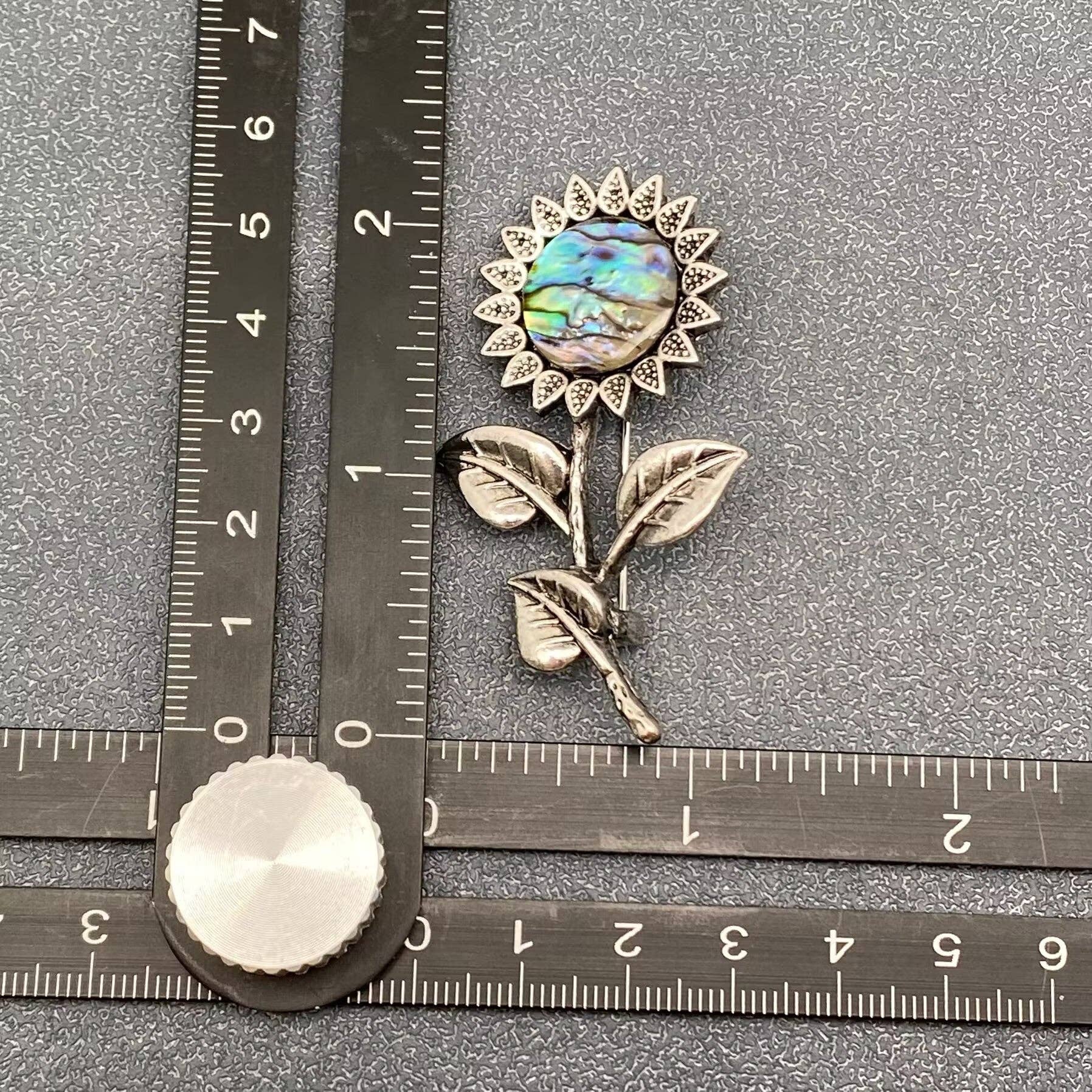 Silver-tone carved sunflower with abalone shell center.