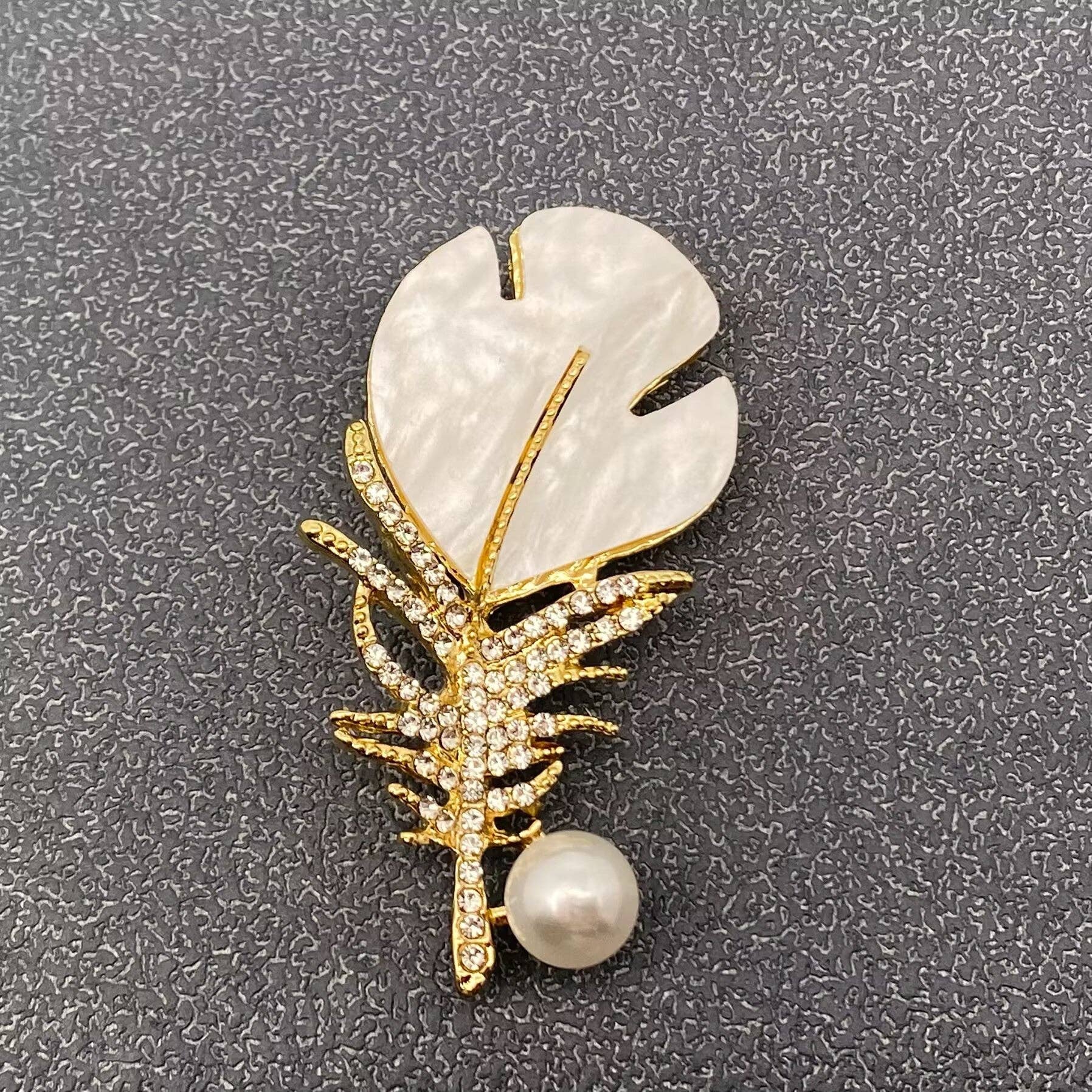 Silver-tone crystal rhinestone feather with a faux pearl accent.