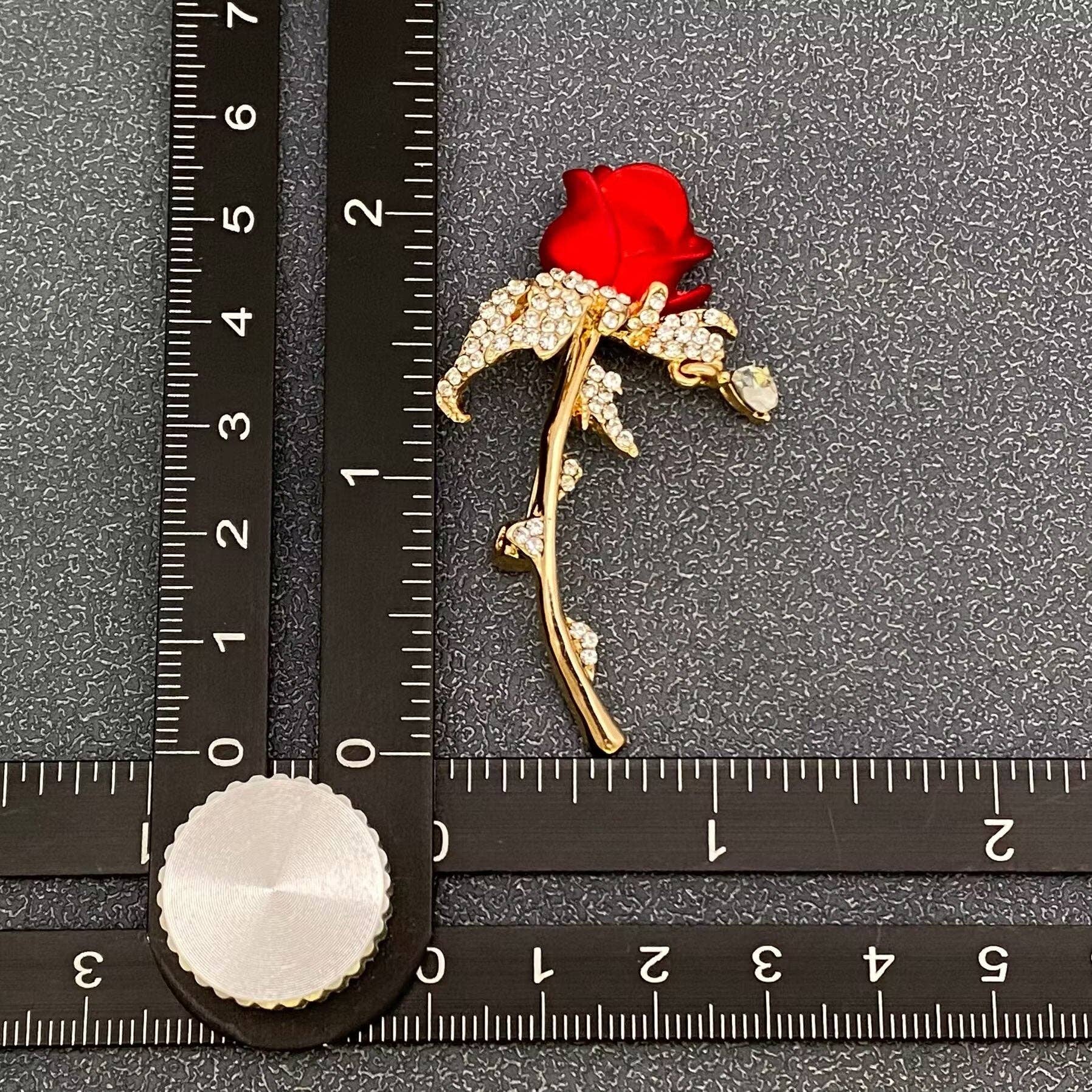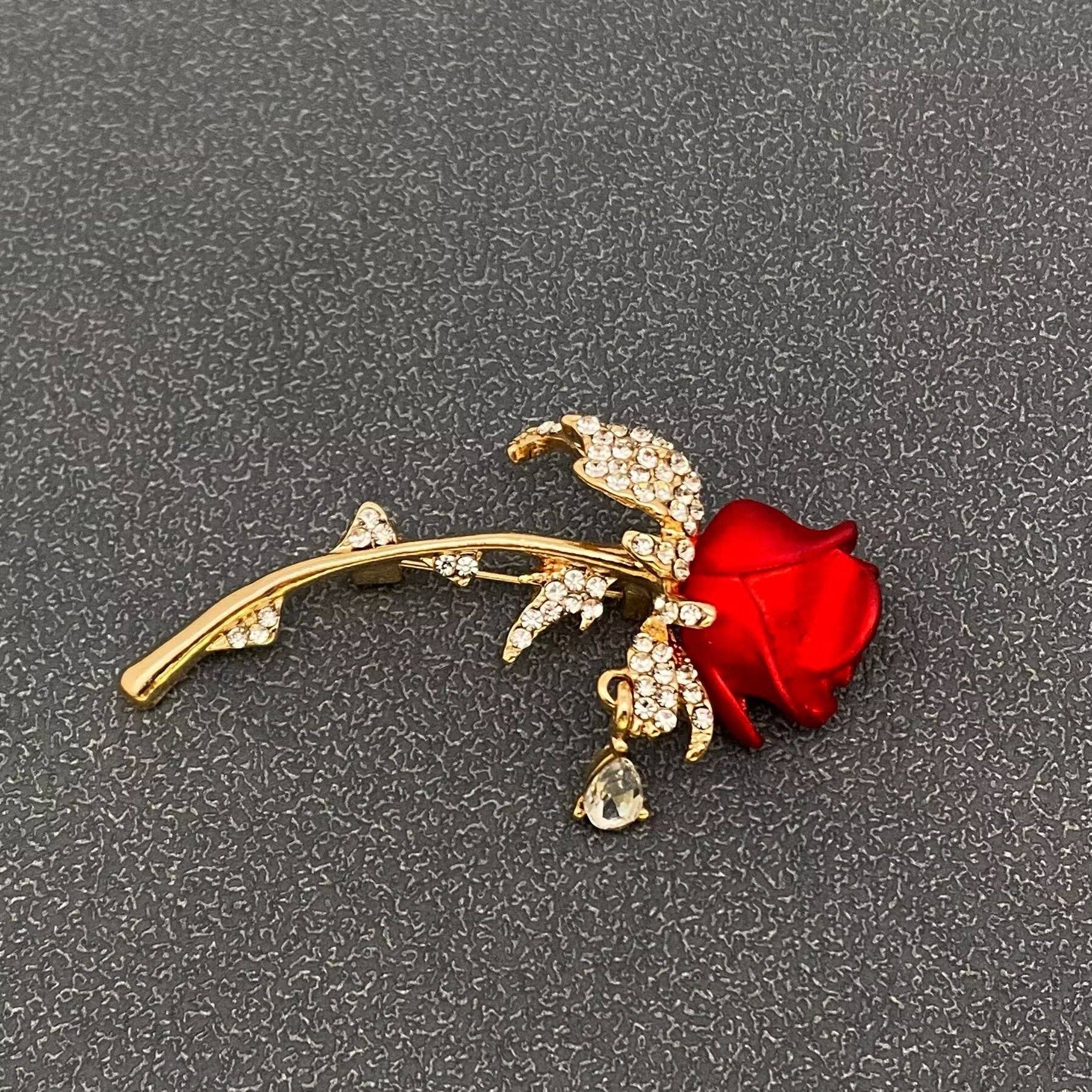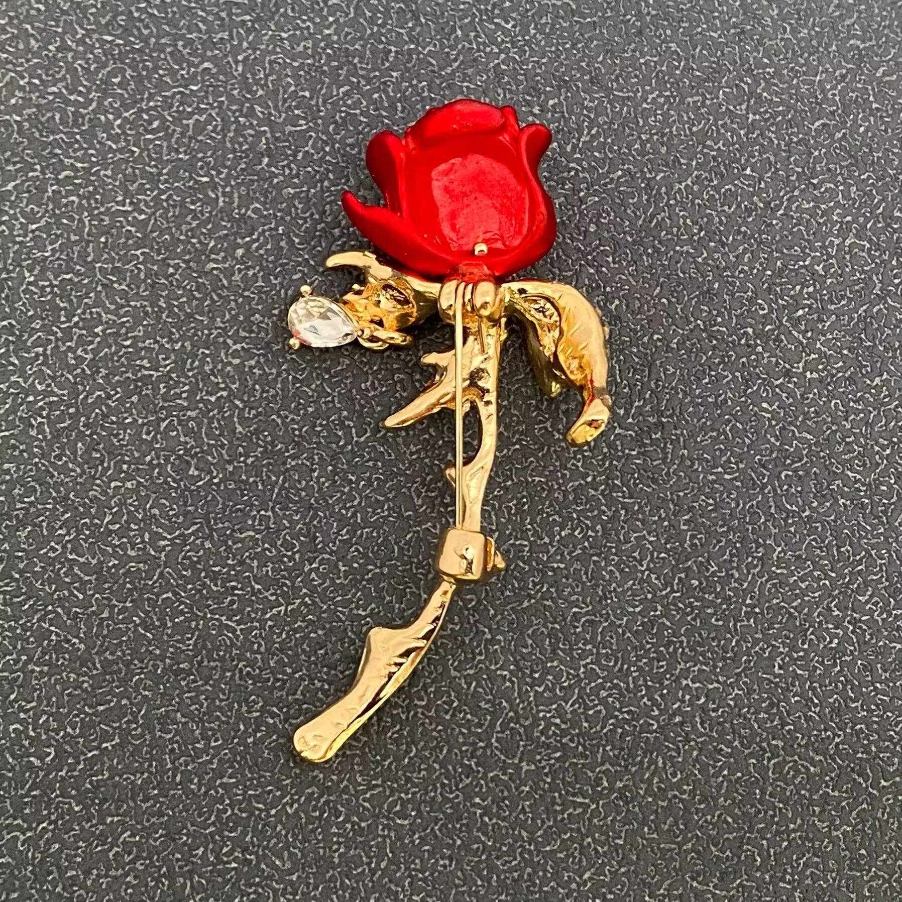 Deep red enameled carved rose with white crystals and golden accents accented with a tear drop crystal dangle.