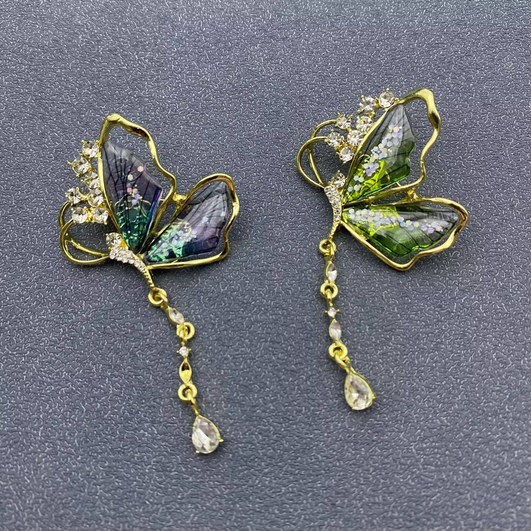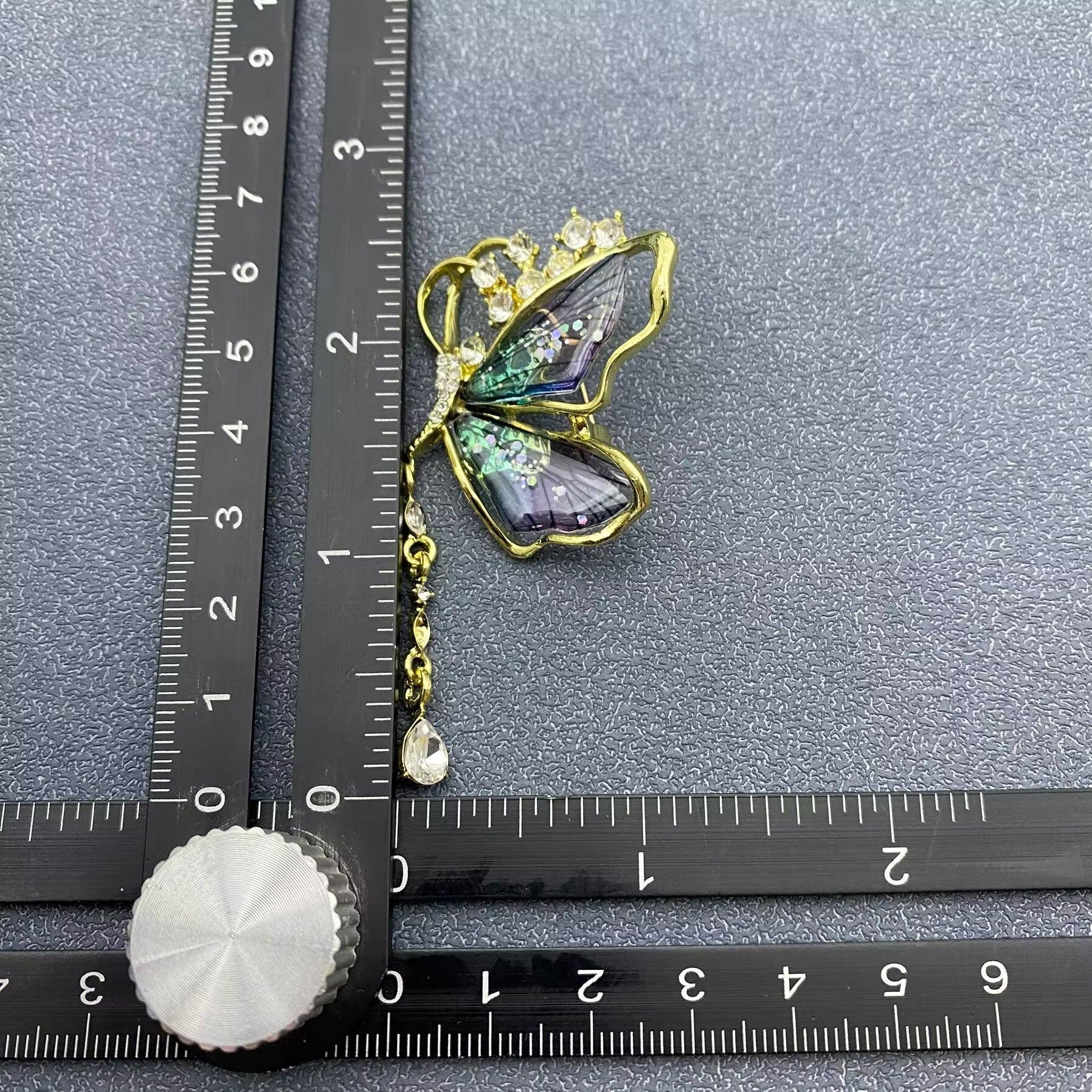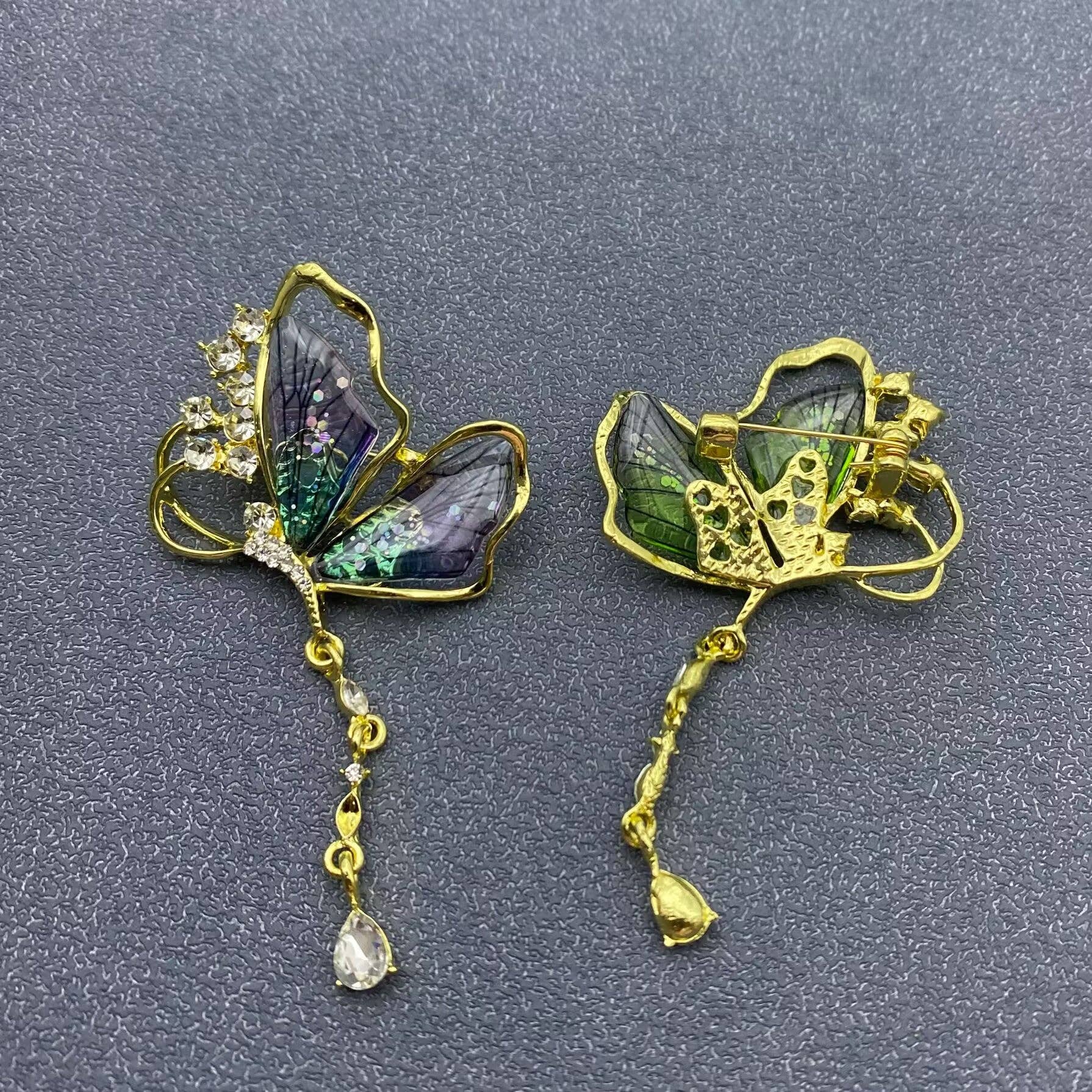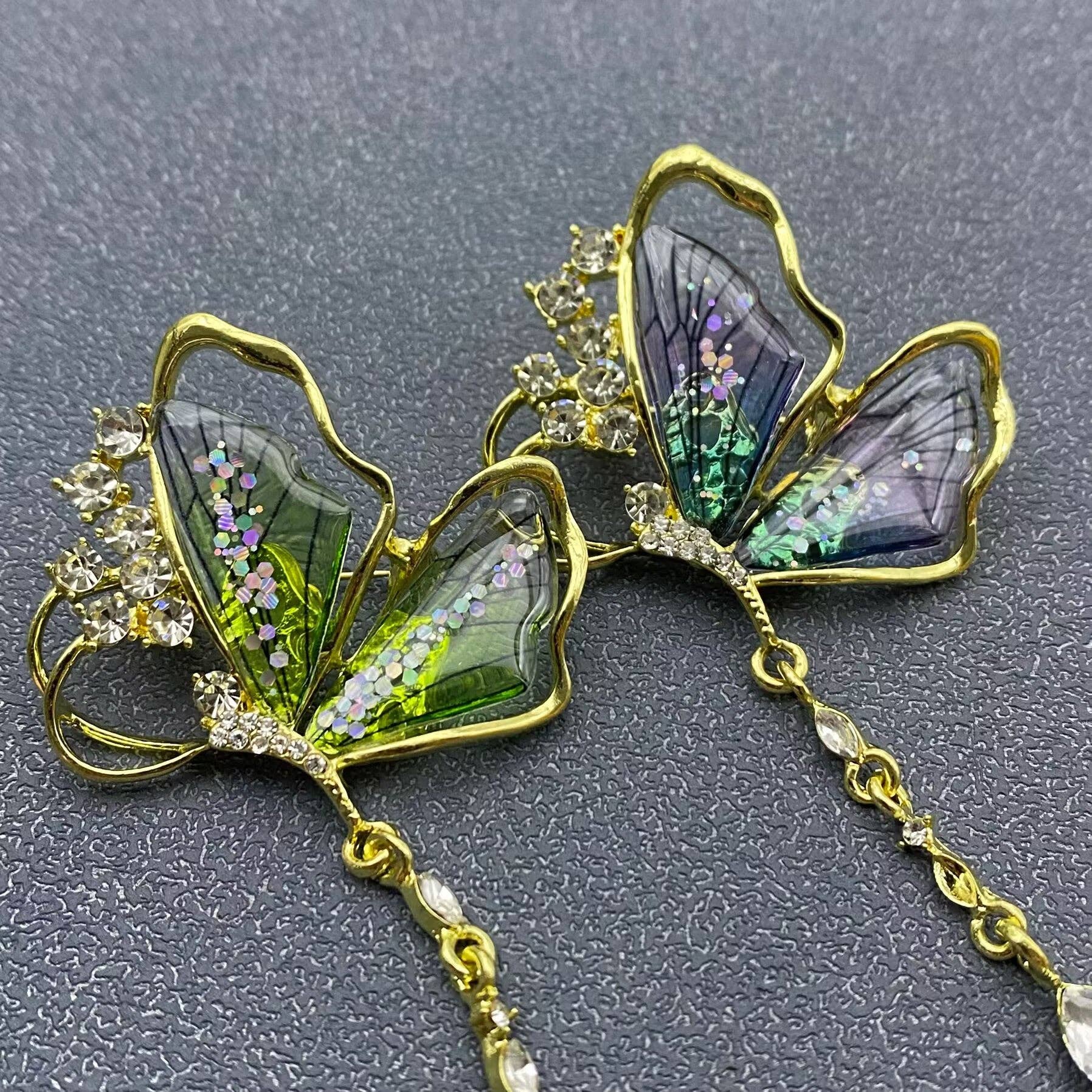 Golden metal and green hand shaped resin with dangling crystal glass rhinestones.