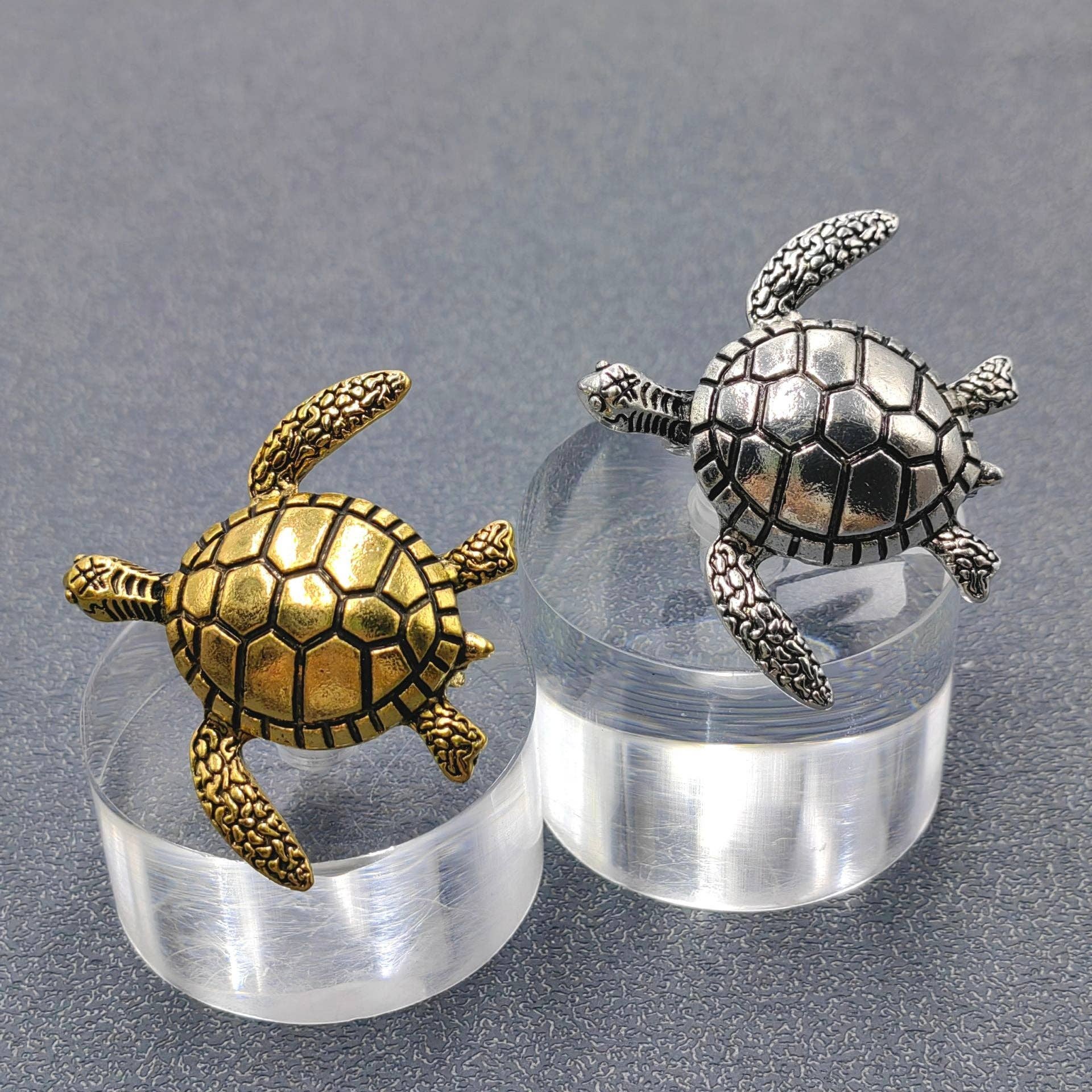 Golden carved metal turtle, very detailed.