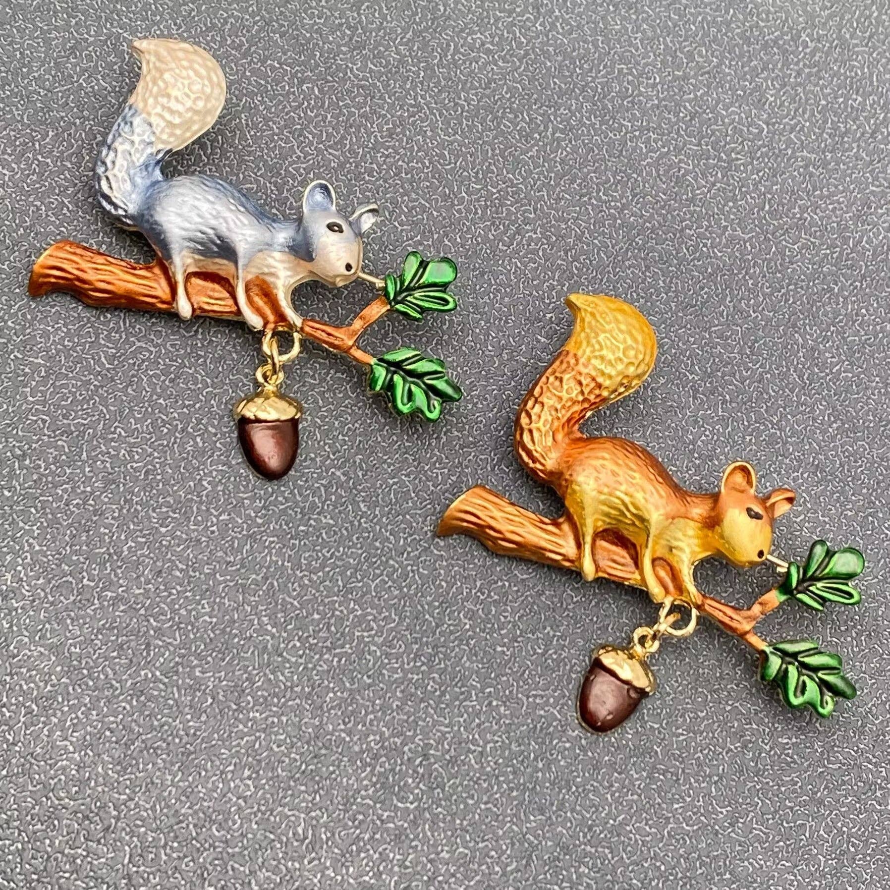 Enameled carved metal squirrel on a tree branch brooch with a dangly acorn charm.