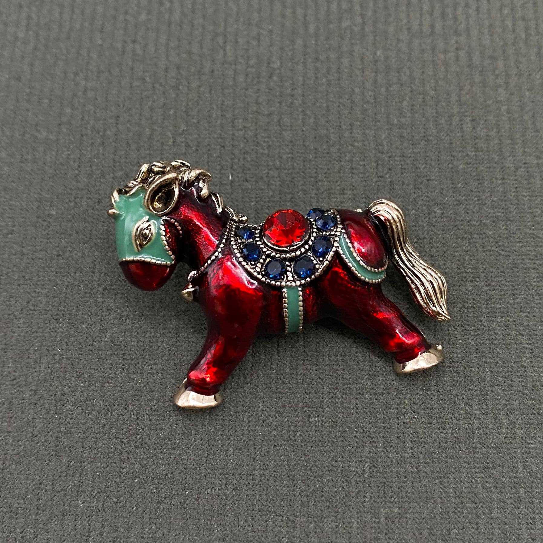 Vintage inspired playful cherry red enamel horse. Beautiful details.