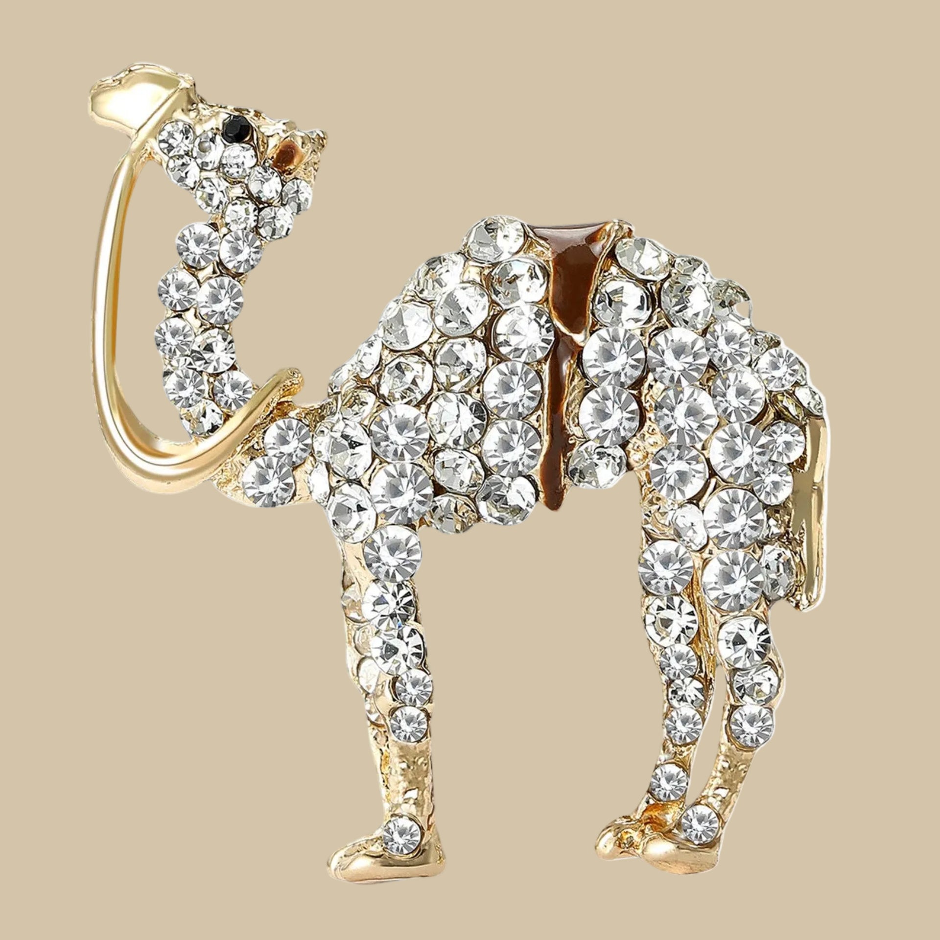 Strut your boldest self with this audacious Golden Pave' Rhinestone Camel Brooch. Hand-crafted with shimmering clear pave rhinestones that catch every light, this statement piece features a richly detailed brown enamel saddle and gleaming golden accents.