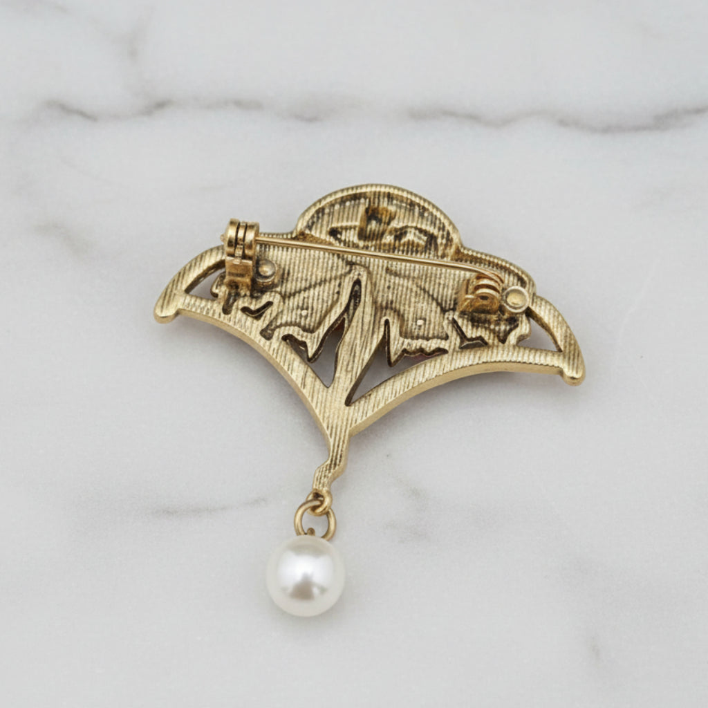 Inspired by the refined aesthetics of Art Nouveau master Eugène Feuillâtre, this exquisite brooch captures the movement's signature elegance. The design features plique-à-jour–style enamel that creates a luminous, open-work effect, allowing light to dance through delicate color gradations. Pavé-set crystals provide sophisticated sparkle, while faux cabochon opal beads and a graceful dangling faux pearl add dimensional interest and movement. A timeless statement piece for those who appreciate designer-inspired craftsmanship and vintage-influenced jewelry aesthetics.